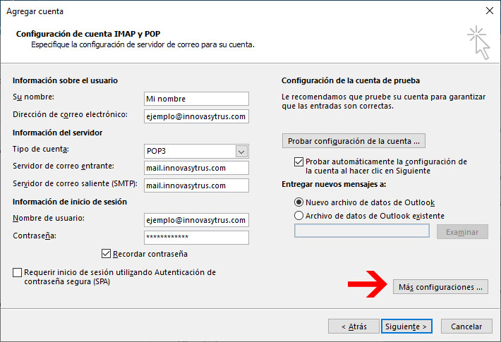 En información de inicio de sesión, siempre colocaremos nuestro correo que estamos configurando en el campo usuario, y la contraseña del correo en el campo del mismo nombre. Lo siguiente que haremos es pulsar el botón Más configuraciones.