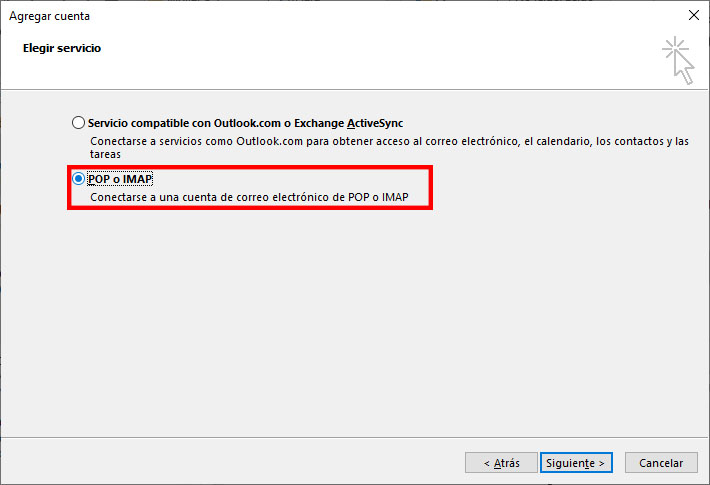 Luego te aparecerá la siguiente ventana, la cual usaras la opción de abajo nuevamente que dice POP e IMAP, luego pulsamos siguiente.
