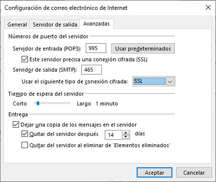 Por ultimo vamos a ir a la pestaña Avanzadas, y aqui requerimos los puertos del servidor. Nuevamente estos datos se los debe suministrar su proveedor de Hosting. Normalmente para POP3 es 995 y para SMTP el 465. Ingresaremos esos numeros y marcaremos la casilla Este Servidor precisa una conexión cifrada (SSL) ya lo ultimo es solamente desplegar la opción donde dice Usar el siguiente tipo de conexión cifrada, y seleccionar SSL, debe quedar como en la siguiente imagen: