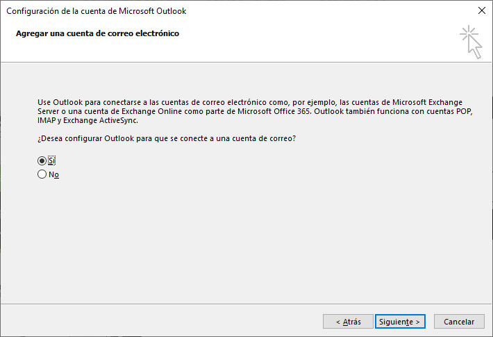 Luego nos indicará que si deseamos agregar una cuenta de correo electronico a Outlook con lo que marcaremos el Sí y nuevamente le pulsaremos Siguiente