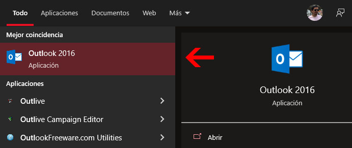 Primero vamos a abrir nuestro programa de Outlook, si tenemos todo el paquete de office instalado podremos usar el buscador de Windows y solo con escribir outlook nos deberá aparecer, sino es así quiere decir que Outlook no esta instalado en su computador. Recuerda que Outlook es un programa de pago, si no puedes obtenerlo te recomiendo usar Thunderbird, que es gratis. Puedes ver nuestro tutorial de Thunderbird pulsando aquí.