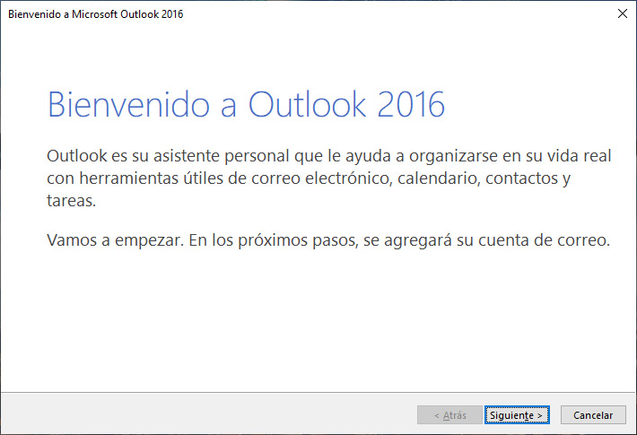 Lo primero que aparecera sera la siguiente ventana de Bienvenida a Outlook 2016, por ello simplemente pulsaremos siguiente.