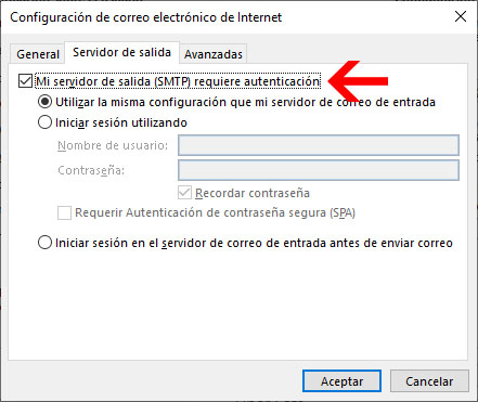 Nos abrira una ventana, la cual iremos a la pestaña Servidor de Salida, y allí marcaremos unicamene la casilla Mi servidor de salida (SMTP) requiere autenticación. como aparece en la siguiente imagen: