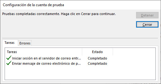 Marcamos aceptar, y volveremos a la ventana anterior. Donde simplemente pulsaremos Siguiente, y Outlook comenzará a hacer pruebas. Intentara iniciar sesión en tu correo y luego enviar un mensaje para saber si lo puede recibir. Si es así marcara todo como completado como aparece en la imagen. Pulsaremos cerrar.